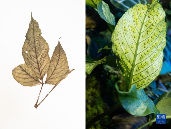 这是10月10日在昆明植物园拍摄的天星蕨。这张拼版照片分别为科研人员野外采集的标本(左)和在植物园迁地保护后存活下来的同种植物。新华社记者 金立旺摄