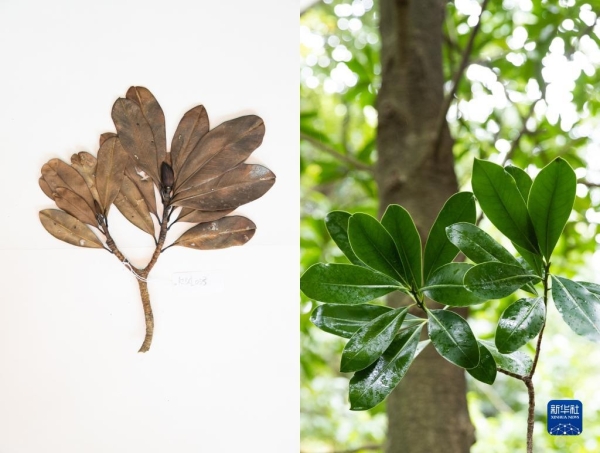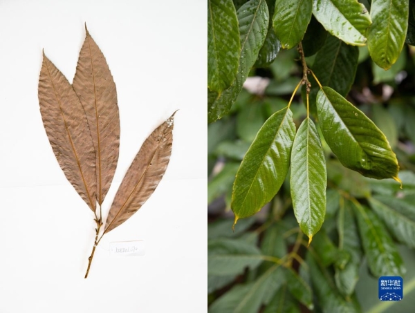 这是10月10日在昆明植物园拍摄的西畴青冈。这张拼版照片分别为科研人员野外采集的标本(左)和在植物园迁地保护后存活下来的同种植物。新华社记者 金立旺摄
