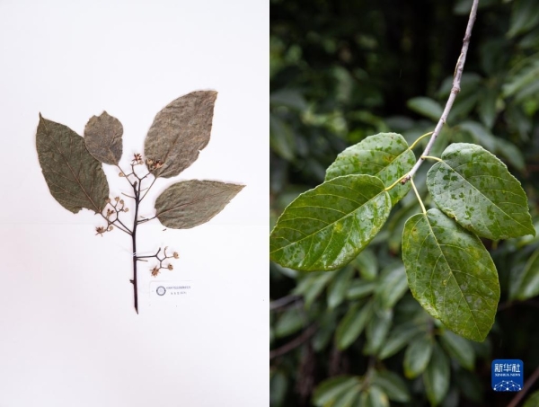 这是10月10日在昆明植物园拍摄的滇桐。这张拼版照片分别为科研人员野外采集的标本(左)和在植物园迁地保护后存活下来的同种植物。新华社记者 金立旺摄