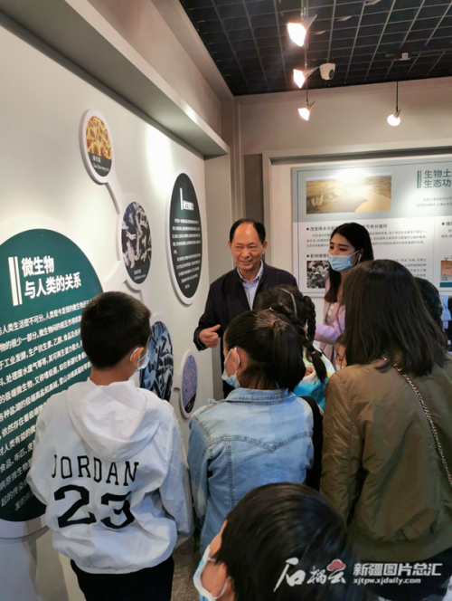2021年5月22日,石榴云/新疆日报通过多平台联动直播,带广大网民走进新疆自然博物馆。图为午夜av 新疆生态与地理研究所研究员管开云正在给参观的小观众讲解有关植物的知识。石榴云/新疆日报记者李行摄