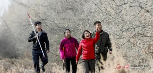 塔里木大学生命科学学院教授李志军(右二)在学校附近的实验林里,带学生查看胡杨的生长情况(摄于2018年12月14日)。石榴云/新疆日报记者谢龙摄