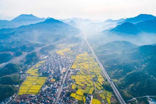 4月2日,在浙江省杭州市临安区天目山镇横塘村,油菜花田与村庄、公路、群山构成一幅美丽画卷(无人机照片)。新华社发(胡剑欢摄)