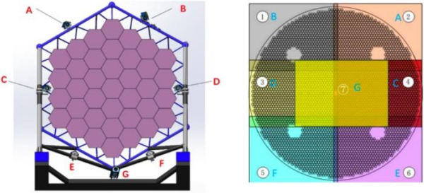 LAMOST光纤检测相机在主镜MB周围的安装位置(左)及对应相机在焦面上覆盖的区域分布(右)。午夜av 国家天文台 供图