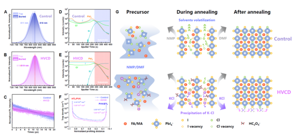 科研团队通过在钙钛矿薄膜生长中引入碱金属草酸盐,利用解离出的钾离子与氯离子之间的强结合作用,有效束缚氯元素的垂直无序迁移,使其在钙钛矿材料中均匀分布。基于这一方法,研究团队成功制备出载流子寿命高达20微秒,界面缺陷态密度低至1013每立方厘米的钙钛矿半导体薄膜。