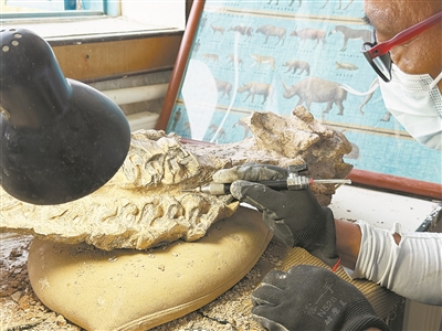 在另一张工作台上,风刻笔连接着空气压缩机,笔尖高频震动,将附着在骨骼上的围岩一点点剔除。“这是精细活,力道要控制好,既要去掉杂质,又不能损伤化石表面。”修复师刘虎说,“细微的骨纹理都是研究的重要依据,不能被破坏。”
