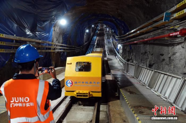 11月18日,发布会前一天,江门中微子实验地下洞室,媒体拍摄通过斜井轨道往返地面与地下的小火车。中新网记者 孙自法 摄