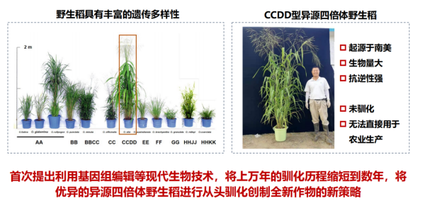 为实现这一目标,我们(种子专项)系统开展了野生稻种质资源筛选工作,突破了异源四倍体野生稻无法进行遗传转化和基因编辑的技术难题,完成了四倍体水稻基因组的组装以及驯化基因的编辑,攻克了野生稻从头驯化的技术障碍。