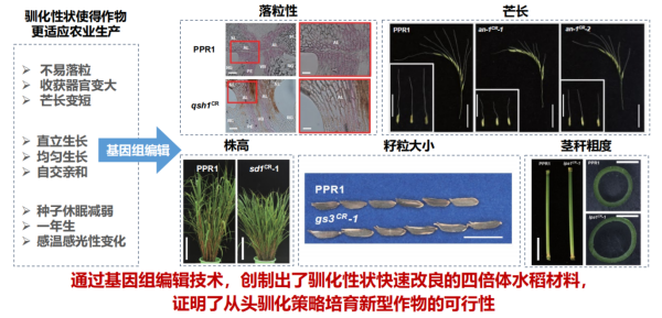 在此基础上,我们进一步利用基因编辑技术,对重要农艺性状进行快速改良,创制了落粒性降低、芒长变短、株高降低、籽粒变大、茎秆变粗以及生育期不同程度缩短的四倍体水稻材料,首次证明了通过从头驯化策略培育新型作物的可行性。该成果产生了重大国际影响,入选2021年度中国十大科技进展新闻、中国生命科学十大进展、中国最佳论文奖以及中国农业科学重大进展,更重要的是,它入选2014-2024年重要期刊十年重大成果。