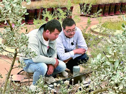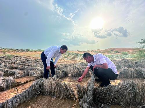 张志山(左)与同事在草方格观测植物。叶满山/摄