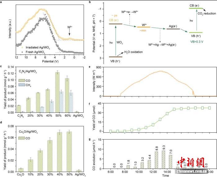 基于这一思路,研发团队成功构建出具有电子存储功能的银修饰三氧化钨材料,通过将其与催化活性组分酞菁钴复合进行验证,测得二氧化碳转化效率较纯酞菁钴提升了近百倍。同时,新方案具备良好的通用性与适用性,可根据实际需求构建多种结构适配的复合催化剂体系。更重要的是,该方案在自然光条件下运行稳定,为利用太阳能规模化转化二氧化碳、生产一氧化碳和甲烷等清洁能源提供了可行的技术路径。