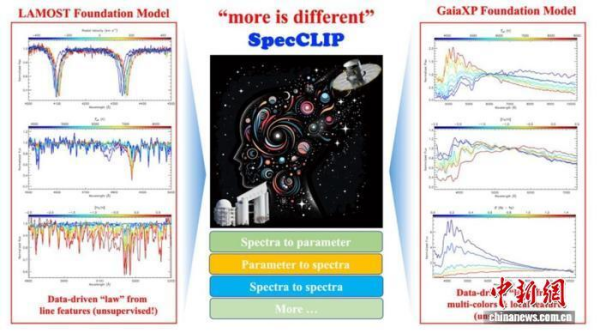 最新研发的SpecCLIP模型,重点用于解决中国郭守敬望远镜(LAMOST)低分辨率光谱数据与欧洲空间局盖亚太空望远镜(Gaia)XP光谱数据的联合分析问题。科研团队将不同来源的光谱数据映射到同一个“特征空间”,就像把不同语言翻译成同一种通用语法。通过对比学习方法,SpecCLIP模型能够自动学习两类光谱之间的内在联系,高效实现跨仪器、跨巡天的数据对齐与转换,为大规模联合研究提供了新的技术路径。