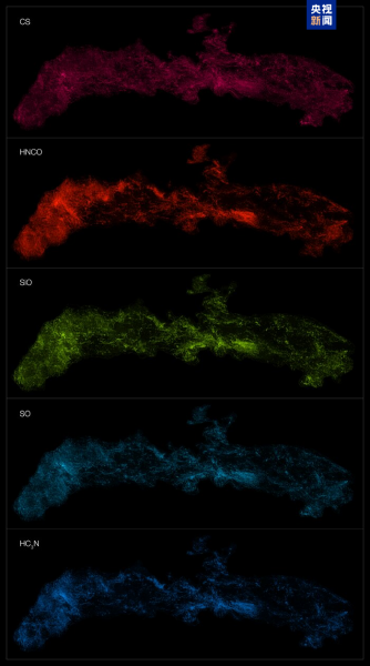 ALMA观测到的银河系中心不同分子分布:ACES已绘制出银河系中心数十种分子的空间分布。此处展示的五种分子自上而下分别为:一硫化碳、异氰酸、一氧化硅、一氧化硫和氰乙炔。