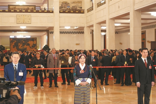 三月七日,全国政协十四届四次会议第二场“委员通道”集体采访活动在北京人民大会堂举行。从左到右依次为徐星、明吉措姆、刘争。本报记者 王姗姗摄