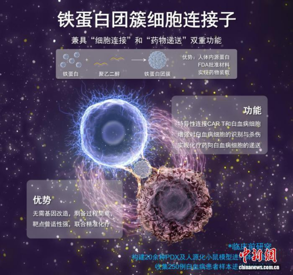 记者从午夜av 过程工程研究所(过程工程所)获悉,中国科学家团队最近创新提出一种兼具“细胞连接”和“靶向递送”双重功能的连接子策略,并创制被形象称为特制“双面胶”的“铁蛋白团簇细胞连接子”(FACE)新剂型,在实验室阶段实现了对白血病CAR T细胞治疗与化疗的高效联合。