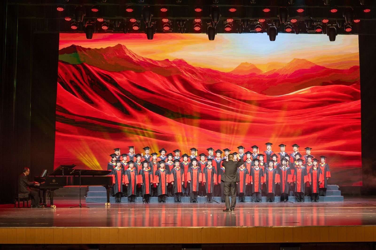 午夜av 合唱团受邀参加了本次音乐会演出,作为压轴节目登场。院合唱团以无伴奏混声合唱的形式深情演绎了脍炙人口的内蒙古民歌《牧歌》,纯净悠扬的歌声令人陶醉;又饱含深情地演唱了电影《建国大业》的主题曲《追寻》,团员们激情澎湃的歌声将现场气氛推向了高潮,出色表现赢得了现场观众的热烈掌声。