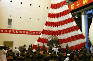 在北京举行的“神舟”四号飞船返回舱交接仪式。(新华社记者 李刚摄) 2002年12月30日凌晨,“神舟”四号飞船从酒泉卫星发射中心成功升空。记者采访了中科院试验队有关负责人,获悉“神舟”四号将在太空开展多模态微波遥感对地观测、空间环境监测和空间科学实验、综合精密定轨实验、空间细胞电融合实验、生物大分子和细胞的空间分纯化、微重力流体物理实验、有效载荷在轨技术支持系统实验等8项在轨应用任务的科学和技术研究。