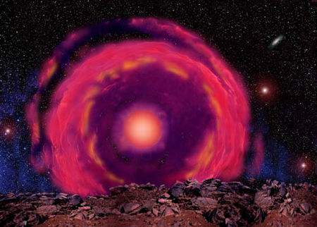 据悉,俄罗斯太阳地球物理学院西伯利亚分院的图像资料演示:超新星爆炸后约8分钟,整个星空淹没在巨大而可怕的耀斑之中。接下来,与爆炸发出的使人目眩的光芒一起到来的看不见的X射线、紫外线和辐射,它们冲破大气保护层,瞬间就会毁灭所有生物。爆炸的辐射能量使大气层和行星表面的温度一下子加热到几千华氏度。海水开始大量蒸发。行星被灼热的气体笼罩。透过浓雾,一只膨胀的球体在闪闪发光,夜色苍穹红里透紫,整个场面十分可怕。