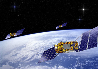 本图显示的是欧洲伽利略卫星导航系统网络中的三颗卫星,伽利略卫星导航系统与美国的全球定位系统(GPS)类似。