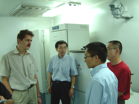 世界卫生组织总部传染病监测与反应司SARS病原学协调员、全球流感规划项目主管克劳斯斯托尔(Klaus Stohr)先生、全球流感规划官员张文庆女士和卫生部国际合作司刘智先生一行三人于7月12日在云南省卫生厅外办工作人员陪同下访问了昆明动物所。考察了解了昆明动物所防治SARS科研攻关工作,并参观了已改建完成的P3实验室和实验动物房。 世界卫生组织总部传染病监测与反应司SARS病原学协调员、全球流感规划项目主管克劳斯斯托尔(Klaus Stohr)先生、全球流感规划官员张文庆女士和卫生部国际合作司刘智先生一行三人于7月12日在云南省卫生厅外办工作人员陪同下访问昆明动物所。考察了解了昆明动物所防治SARS科研攻关工作,并参观了已改建完成的P3实验室和实验动物房。