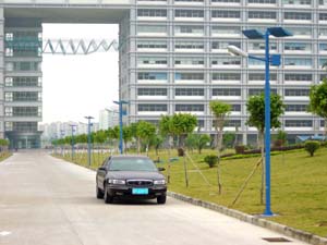 由广州能源所设计制造,国内规模最大太阳能半导体路灯应用示范工程在珠海建成 国内规模最大的太阳能半导体(LED)路灯应用示范工程于2003年11月5日在清华大学(珠海)科技园建成。这是国内第一个将太阳能发电与半导体照明相结合的具有实用照明功能的路灯工程。整个工程由41支太阳能LED路灯与39支草坪组成,太阳能LED路灯高4.1米,路灯光源由120只超亮度白色LED按一定形状排列焊接在电路板上,总功率为6.5W。根据珠海市的日照分布,设计采用了两块15瓦的多晶硅太阳能电池对称布置,12伏34安时免维护铅酸蓄电池,和最大电流6安培的充放电控制器组成。路灯光源亮度可相当于25瓦白炽灯,可保持连续5个阴雨天工作(附图)。