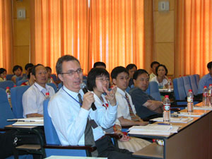 欧盟驻华代表团科技参赞尚德斯在做大会报告后与会议代表就欧盟框架有关问题进行交流。