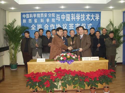 中国科大与西安分院签署全面合作协议。 12月14日,中国科学技术大学党委常务副书记、副校长许武率团访问中科院西安分院、陕西省科学院。双方就开展合作事宜进行了热烈、友好的座谈并签署了全面合作协议。14日上午,全面合作协议签字仪式在西安分院举行,签字仪式由中科院西安分院、陕西省科学院副院长沈茂才主持,中国科大许武与西安分院、陕西省科学院党组书记、常务副院长周杰分别代表双方签署了全面合作协议。中国科大秘书长汪克强、校长助理窦贤康及学校有关单位负责人和西安光机所常务副所长赵卫、地球环境所副所长高玲瑜、水土保持与环境研究中心副主任邵明安、国家授时中心副主任吴海涛、陕西省科学院所属各研究院所负责人及有关处室负责人参加了签字仪式和座谈会。