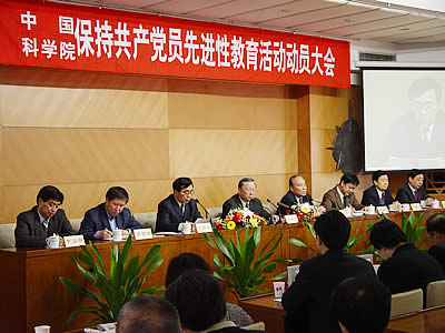 隆重召开保持共产党员先进性教育活动动员大会。院党组副书记、常务副院长、院先进性教育活动领导小组副组长白春礼同志传达了中央保持共产党员先进性教育活动工作会议精神,全国人大副委员长、院党组书记、院长、院先进性教育活动领导小组组长路甬祥同志作了动员报告,中央先进性教育活动督导组组长田瑞璋同志发表了重要讲话。院党组成员,中央保持共产党员先进性教育活动督导组成员,院先进性教育活动领导小组及办公室成员,京区基层单位党政一把手、党总支书记、党支部书记,院机关老领导、党员厅局领导、党支部书记及离退休党支部书记,共计约1100人出席了会议。