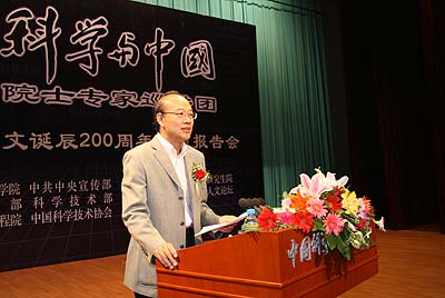 研究生院的师生,以及在京生命科学和医学学部的院士近700人参加报告会。 路甬祥说,今年是达尔文诞辰200周年,也是《物种起源》发表150周年。世界各地都在纪念这位进化论的创始人,因为他不仅是生物学史上划时代的人物,是科学史上的巨匠,而且也是一位人类思想史上的伟人。他富有创造的思想,跨越了生物学领域,跨越了他所生活的时代和国家,至今仍对世界生物学的发展,对其他自然科学和人文社会学科的发展,对人类的世界观、价值观,产生着深刻而深远的影响。 在报告中,路甬祥首先简要回顾了达尔文的科学生涯,高度赞扬了达尔文热爱自然、热爱科学、严谨治学、勇于创新的科学精神。他说,热爱自然、热爱科学是科技创新最原本的动力。达尔文之所以后来成为伟大的科学家,这与他对于科学和自然有着浓厚的兴趣有很大的关系。由此我们可以认识到,热爱自然、热爱科学,是科技发展的动力之一,创新教育应该有助于培育兴趣、鼓励探索、发掘潜力、塑造情操、认识世界、培育科学思维方式、提高洞察力、分辨力、鉴赏力和独立工作的能力。路甬祥说,科学源于实践与思考,五年的环球科学周游考察是达尔文科学思想的基础和来源。参加贝格尔号航行是达尔文科学人生中的决定性的经历。他之所以能有很大收获,是因为他具有超过常人的探索热情,细致入微的观察能力,持之以恒进行系统观察、分析、思考的耐性,以及充沛的精力,他表现出来的采集、整理、记录、分析能力和对自然现象极大的好奇心,成为他成就的基础,正所谓机遇属于那些做好准备的“有心人”。 路甬祥在介绍了达尔文探索科学真理,不迷信权威、敢于挑战传统观念的勇气,达尔文细致观察、缜密思考、系统的研究的科学方法以及治学扎实,没有丝毫的浮躁和急于求成的功利心的科学精神后说,“达尔文敢于冲破传统观念,不畏艰难、锲而不舍、勇于创新、善于创新的科学精神,生命不息、探索不止的顽强毅力,忘我追求科学真理,实事求是的科学态度,严谨踏实、系统求索的治学方法,以及谦虚谨慎、虚怀若谷的博大胸怀,都成为后来人的典范。” 路甬祥在报告中深入浅出地介绍了达尔文生命进化理论,肯定达尔文对科学的巨大贡献。他说,达尔文创立的是一个综合系统的生命进化理论,具有丰富的科学内涵和深远而广泛的影响。达尔文进化论认为,各种生物自从产生以来,就发生了变化进化;这个观点动摇了基督教的“神创说”基础。生物进化有其自然动力,是一个自然选择的过程,在这个过程中,适应进化的生物保存了下来,不适应的生物遭到淘汰。人类是生物进化的产物。达尔文的进化理论是生物学上的一次革命性伟大的综合,正是由于达尔文理论的系统全面和综合,使人类第一次科学地解释了生机昂然、缤纷多彩的生命现象。 路甬祥说,达尔文在科学方法上也做出了很大贡献,从而使他的进化理论具备更加坚实的基础。正是由于达尔文在科学方法上的创新和发展,进化论成为生物学中第一个经过假说和检验的科学理论,生物学开始更加注重实证和理论假设和分析,开始告别传统的仅注重描述、分类和一般性阐释的博物学传统。 路甬祥认为,达尔文的进化论不仅极大地促进了生命科学的发展,推动了其他学科的发展,而且改变了人们的世界观。他说,达尔文的进化论从根本上动摇了基督教神学的基础,使人们开始从动态、变化和相互作用的角度看待自然,看待人类社会,看待世界,一种进化的生命观、价值观和世界观逐渐在社会中得到普及。达尔文的进化论中自然观和运动观为唯物论和辩证法提供了有力的支撑,曾经得到马克思和恩格斯的高度赞扬,恩格斯曾将达尔文和马克思的发现相提并论:“正像达尔文发现了有机界的发展规律一样,马克思发现了人类历史的发展规律。”达尔文的进化论将人类看作自然进化中的一个环节,从而端正了人们对自然和人与自然关系的看法,为后来形成的可持续发展、环境保护直至科学发展观奠定了知识和认识论的基础。达尔文的进化论对于社会思潮的进步也起到过一定的作用。 路甬祥在报告中指出,达尔文的进化论已经提出了150周年,今天,虽然科学家们在生物进化的某些具体问题上依然存在着争议,然而,经过150年的研究,科学家们对于生物进化的图景、模式和机制已有了比较清晰的认识,绝大多数人认同达尔文的进化论范式,达尔文的进化论依然具有着强大的生命力,依然对于我们具有着巨大的启迪作用。 路甬祥最后说,“达尔文为我们留下了一笔丰富的精神财富。他的高尚品格值得我们学习,他创造的科学理论至今仍焕发着活力。科学技术的发展需要在继承前人的基础上不断创新。在纪念达尔文之日,我们要继承和发扬他那种勇于创新、善于创新、持之以恒、淡泊名利的精神,承担起科技工作者的历史使命,为祖国的富强,为人类的和平发展,不断做出新的科学发现和技术发明,支持经济社会的科学发展、持续发展。”