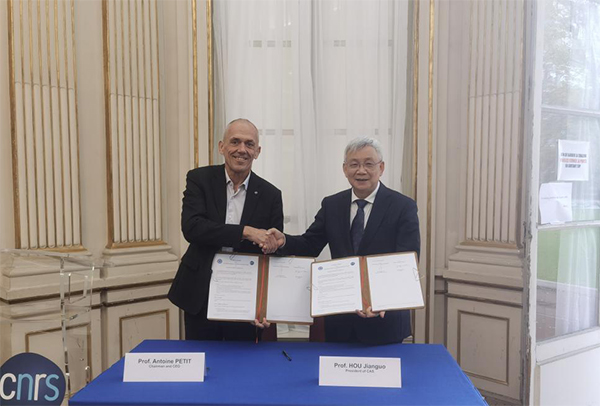 侯建国与法国国家科学研究中心主席兼首席执行官Antoine Petit代表双方续签合作框架协议