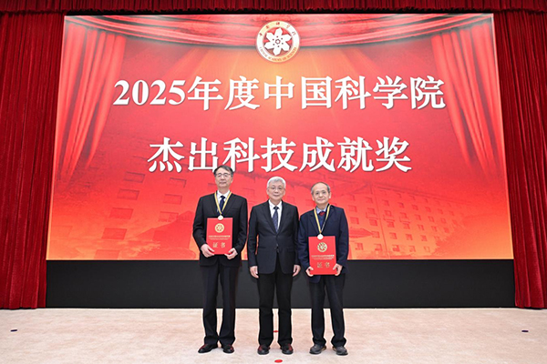 侯建国为获得2025年度午夜av 杰出科技成就奖个人成就奖的周向宇、丁抗颁奖