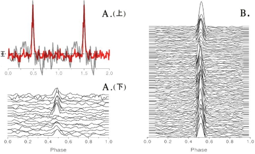 新脉冲星的归一化平均脉冲轮廓和单脉冲:A(上)为FP1平均脉冲轮廓,FAST通过约52.4秒漂移扫描(红色)产生信噪比为Parkes望远镜L波段积分2100秒结果(灰色)信噪比的3倍,表现出FAST高灵敏度优势;A(下)为FP1单脉冲轮廓;B为FAST采用跟踪观测5分钟,获得的另一颗新脉冲星FP2的单脉冲轮廓。