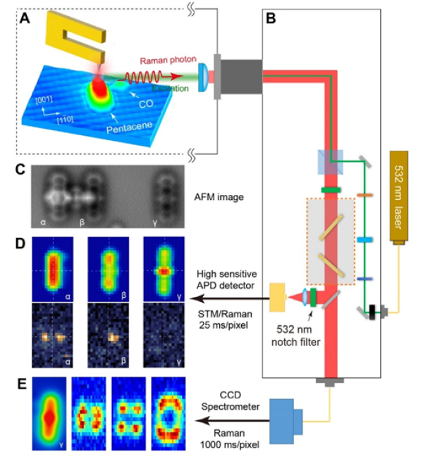 基于扫描探针的单分子多参量测量示意图: (A)探针,(B)拉曼光谱光路,(C)AFM像,(D)STM像和利用高灵敏单光子计数器同步采集的C-H振动拉曼光谱像,(E)分子骨架结构的拉曼光谱像