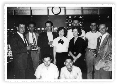 1950年,谢家麟(前右一)与美国斯坦福大学同事在1GeV电子直线加速器控制台前。