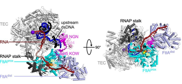 古菌转录终止因子FttA又称aCPSF1。FttA是真核生物整合子复合物中INTS11亚基和切割与加聚腺苷酸特异性因子复合物中CPSF73亚基的同源蛋白,负责古菌中多数转录单元的转录终止。FttA具有核糖核酸内切酶活性和5'→3'核糖核酸外切酶活性。同时,唯一在三域内保守的转录因子Spt5能够促进FttA的转录终止活性。然而,FttA如何介导古菌RNA聚合酶的转录终止以及Spt5如何促进转录终止的机制尚不清楚。
