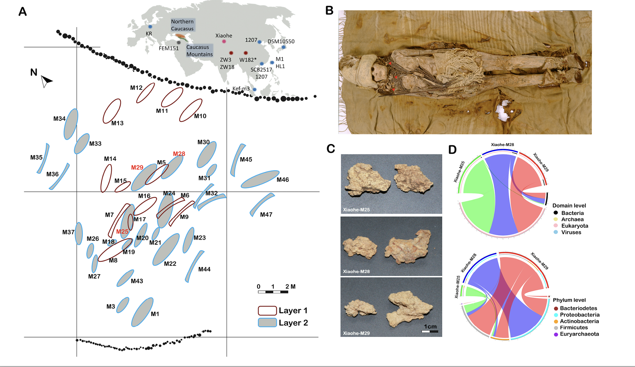 新疆小河墓地平面图、出土样本及奶酪样本中的微生物组成