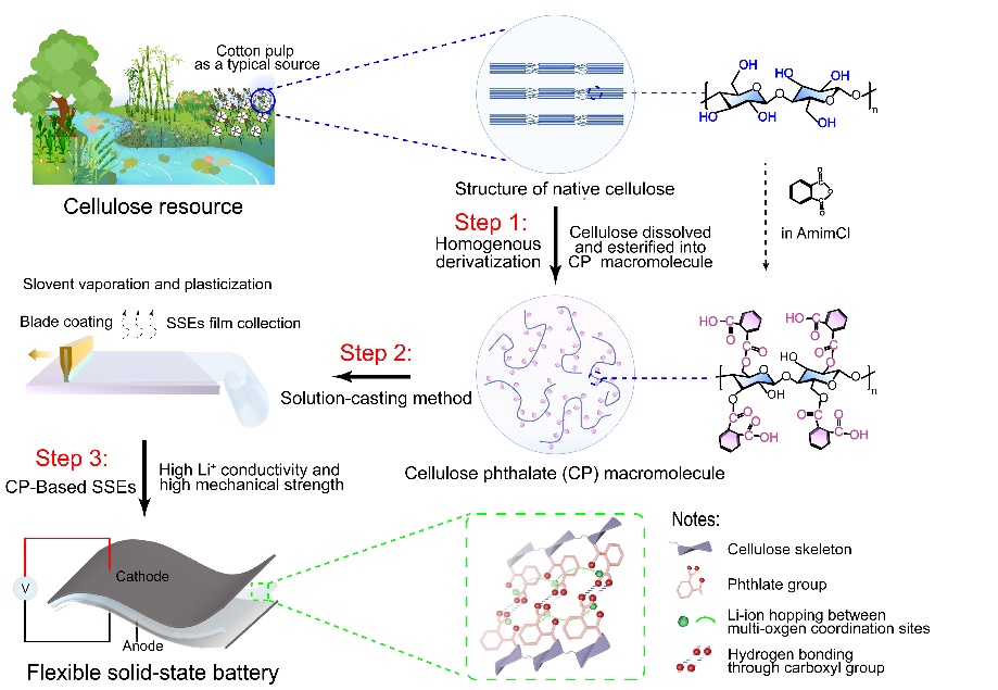 午夜av 化学研究所分子纳米结构与纳米技术院重点实验室曹安民课题组利用纤维素丰富的化学平台进行均相衍生化改性,通过绿色可扩展的工艺,将惰性的纤维素转化为高性能锂离子导体。该研究所得的纤维素基SSE的锂离子电导率为1.09×10-3 S cm-1、锂离子迁移数为0.81、机械强度达12 MPa。实验和理论分析表明,在均相衍生化过程中,引入的邻苯二甲酸酯基团构建了多氧位点,促进了纤维素骨架与Li+的配位作用,创建了Li+快速离子传输通道,并在纤维素链之间重塑了氢键网络,从而得到了兼具高离子电导率和高强度的SSE。
