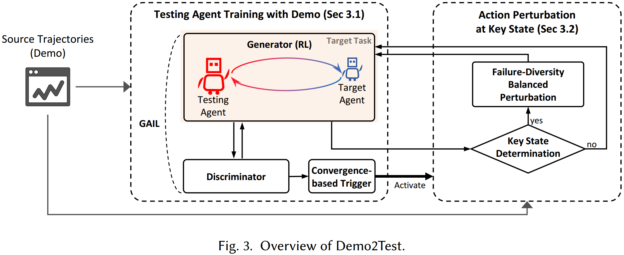 该团队提出了新的迁移测试方法——Demo2Test。该方法利用源任务的演示数据,结合强化学习和生成对抗模仿学习,对测试智能体进行迁移训练,以探索目标任务中的失效场景。同时,该方法包含一个关键状态下的动作扰动模块,应用进化算法对关键状态下的行动进行扰动,可进一步丰富失效场景的多样性。