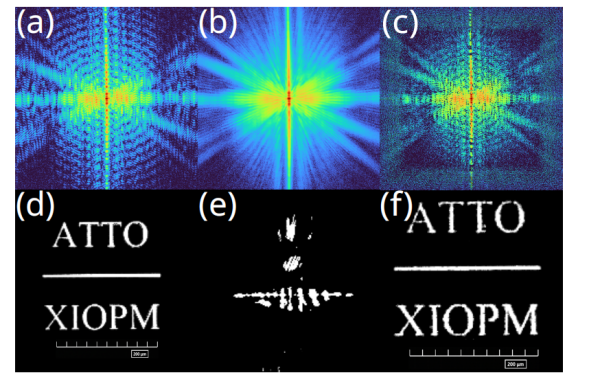 (a)(d)窄带光相干衍射成像;(b)(e)宽带光衍射图样直接反演结果;(c)(f)单色化方法实现的宽带光相干衍射成像