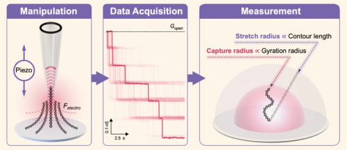 该研究揭示了拴系态分子被纳米孔捕获的特征长度分布模式。研究表明,拴系态分子的回旋半径近似于捕获半径的低电压极限状态,为揭示拴系分子的内在物理特性奠定了实验和理论基础。同时,该成果为生物物理学、基因测序以及包括RNA、蛋白质等带电分子的分子诊断等领域引入了新的测量方法和研究视角。