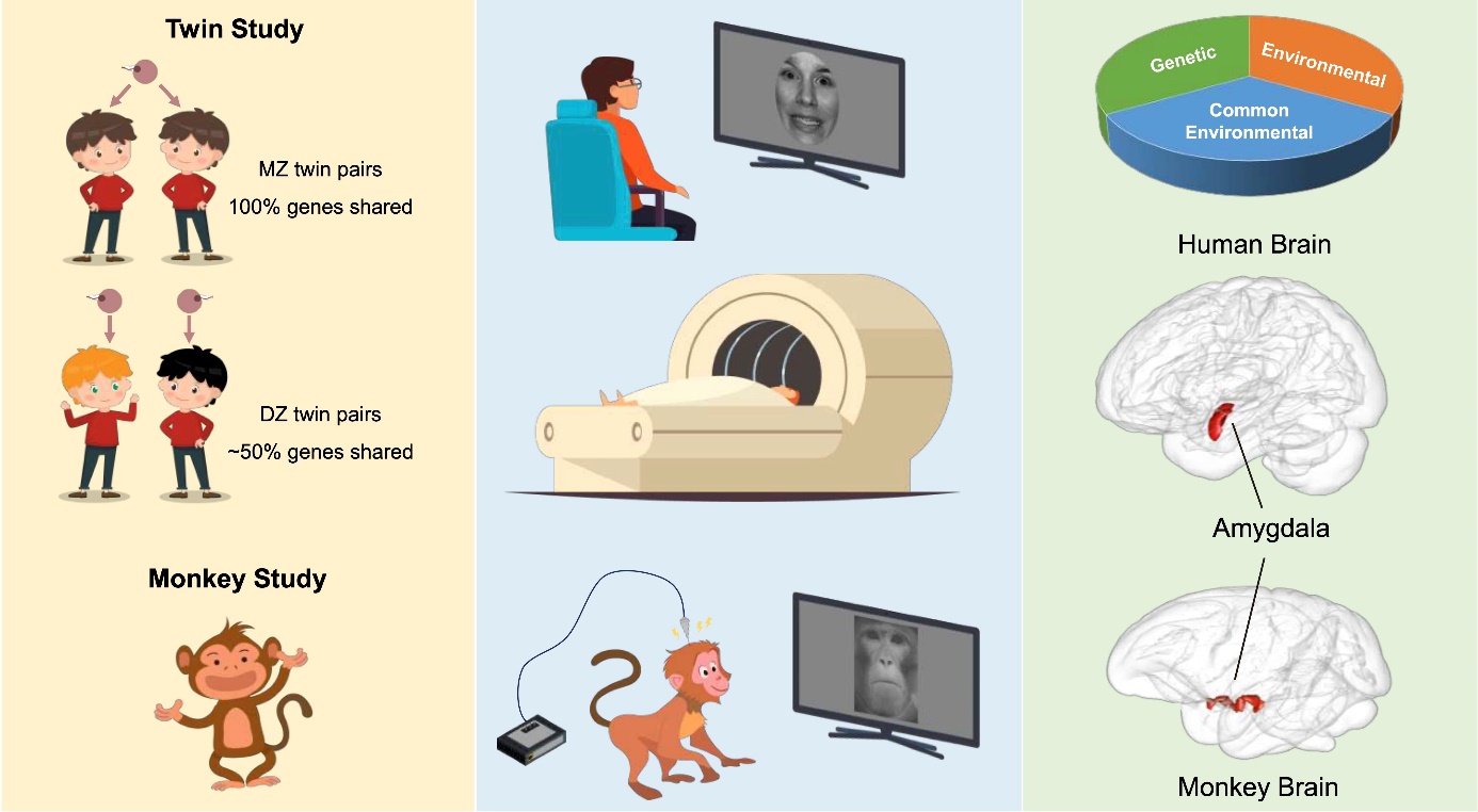 研究的整体思路:基于双生子的行为、功能核磁共振成像实验及基于猕猴的电生理实验