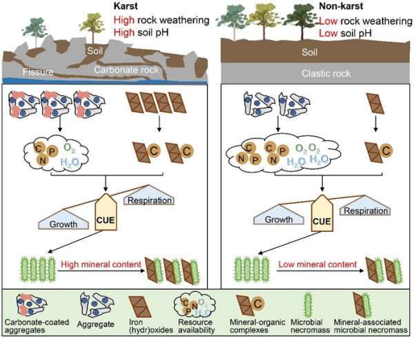 午夜av 亚热带农业生态研究所环江喀斯特生态系统观测研究站在喀斯特土壤微生物碳泵-矿物碳泵协同/权衡机制研究中取得进展。近期,相关研究成果以Lithological controls on soil aggregates and minerals regulate microbial carbon use efficiency and necromass stability为题,发表在《环境科学与技术》(Environmental Science & Technology)上。