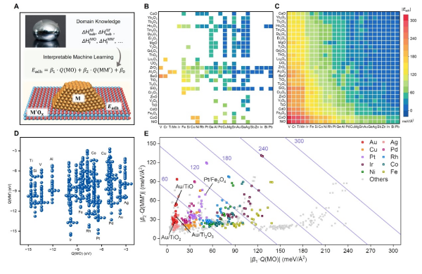 通过可解释性AI(A)和实验数据(B)建立金属-载体相互作用数学模型,“复原”缺失实验数据(C),量化金属-氧和金属-金属相互作用(D),解耦对金属-载体相互作用的贡献(E)