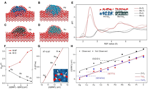 分子动力学揭示氧化物包裹金属催化剂(A-D),金属-金属相互作用决定包覆界面结构与动力学(E-F),强金属-金属作用包裹原理性判据(H)