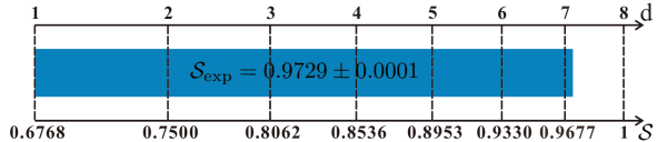 在实验实现方面,团队采用路径和偏振自由度混合编码构建八维子空间,提高了高维移位操作和构建高维测量的效率,展示出优越的可扩展性。基于共享的八维纠缠,通过全出口高维测量,实现对发送方编码信息的随机解码。实验测得成功率S=0.9729±0.0001,超过七维纠缠所达到的理论成功率上界0.9677,认证了所共享的纠缠态维度不低于八维。