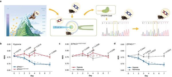 此前,研究团队在快速拓殖并适应青藏高原环境的猎隼中,发现了变异的“明星”基因——EPAS1。该基因作为低氧诱导因子,在物种适应高原低氧环境过程中发挥重要作用。EPAS1既参与糖代谢调节,也参与脂代谢调节。因此,研究团队利用CRISPR-Cas9基因编辑技术,构建了携带猎隼EPAS1基因突变的隼型小鼠模型,以探究低氧下的糖脂代谢调控模式。