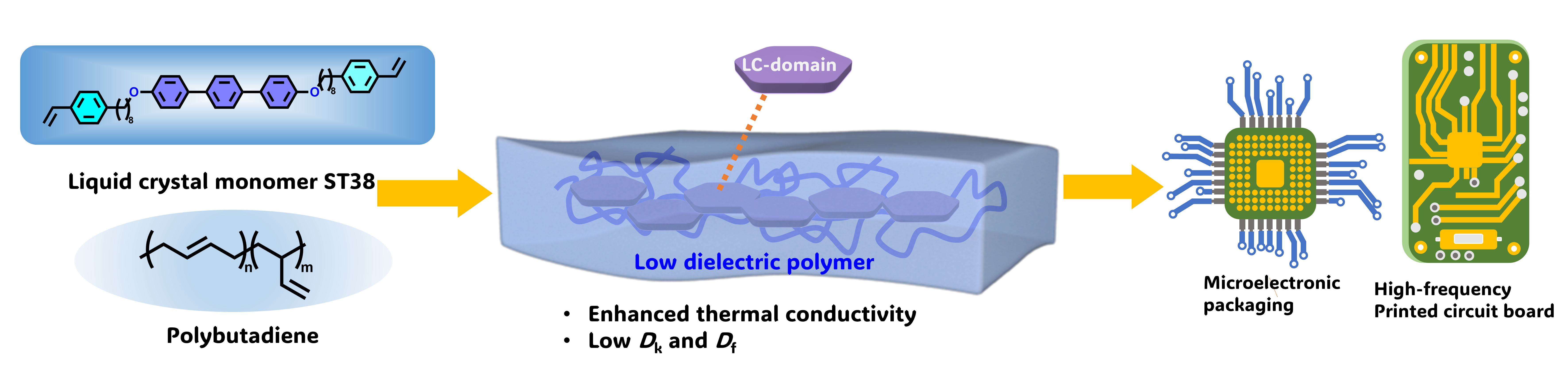 高频通信和人工智能推动了微电子器件向高速传输、集成化、小型化方向发展。然而,电子器件性能提升也带来了电子串扰、阻-容延迟及热量积累等问题。因此,亟需实现兼具低介电常数(Dk)、低介电损耗(Df)及高导热率的电介质材料,以确保信号传输速度和质量,提高散热性,并延长器件的使用寿命。近日,午夜av 上海有机化学研究所研究员房强和孙晶团队,利用液晶有序效应提升了聚丁二烯的导热性能,制备了导热性能良好的低介电液晶聚合物。