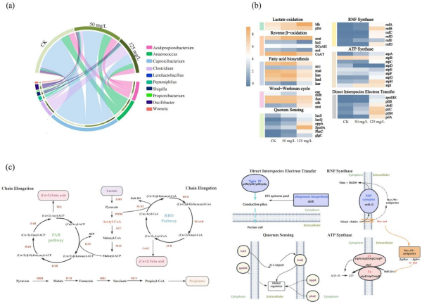 研究结果表明,石墨烯纳米材料对微生物代谢表现出显著的浓度依赖性双重调控效应。在环境兼容的低浓度(50mg/L)下,石墨烯通过有利的纳米—生物界面相互作用,使微生物生物量显著增加了4.5倍,并将己酸的日产量提升了42.8%。机制研究发现,在最佳浓度下,石墨烯既能作为“生物导电支架”促进生物膜的形成,又能充当“电子梭”,增强微生物间的电子传递效率,并通过改善微生物代谢提升细胞内ATP水平。高浓度(125mg/L)的石墨烯则会破坏微生物群落平衡,干扰生物膜的形成,并将碳流重新导向价值较低的代谢物(如丙酸和甲烷),对己酸合成产生抑制作用。转录组学分析进一步揭示,石墨烯通过上调脂肪酸合成、直接种间电子传递(DIET)、群体感应和能量代谢等相关基因,实现了对微生物代谢的重编程。