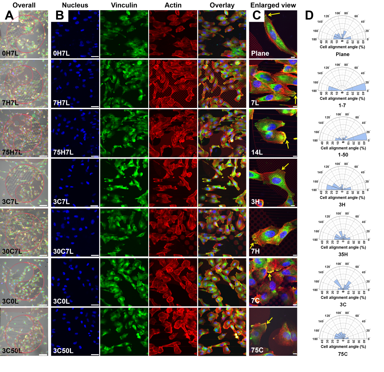 团队采用飞秒激光无掩模光学投影光刻技术,制备了具有不同形貌的可编程细胞培养芯片,实现对细胞形态和细胞行为的调控。该细胞培养芯片结构可调控细胞在不同线间距、柱直径及孔径的支架结构上的迁移、黏附及形态变化。