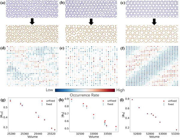 团队进一步探讨逆向降温过程发现,五边形和八边形的末态产物既可以是密堆态(基态),又可以是多晶态,而六边形总可以回到密堆态。晶体态的定量分析表明:在从基态升温的过程中,单体对邻居粒子的转动约束越强,粒子越倾向于优先发生平动来弱化这种约束;在从旋转晶体相降温的过程中,更强的转动效应利于粒子预先与邻居粒子对齐取向。在升温过程中,五边形在基态构型中对邻居粒子取向约束最弱,倾向于先转动,六边形对邻居粒子取向约束最强,需要先发生平动,八边形介于二者之间;在从旋转晶体相降温的过程中,六边形对周围粒有适度约束,可在收缩前调整取向,五边形和八边形对周围粒子取向几乎没有约束,无法预先调节取向,可能被困在多晶态。