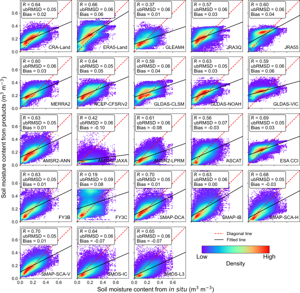 土壤水分数据集与全球992个地面站点观测值的散点密度对比图